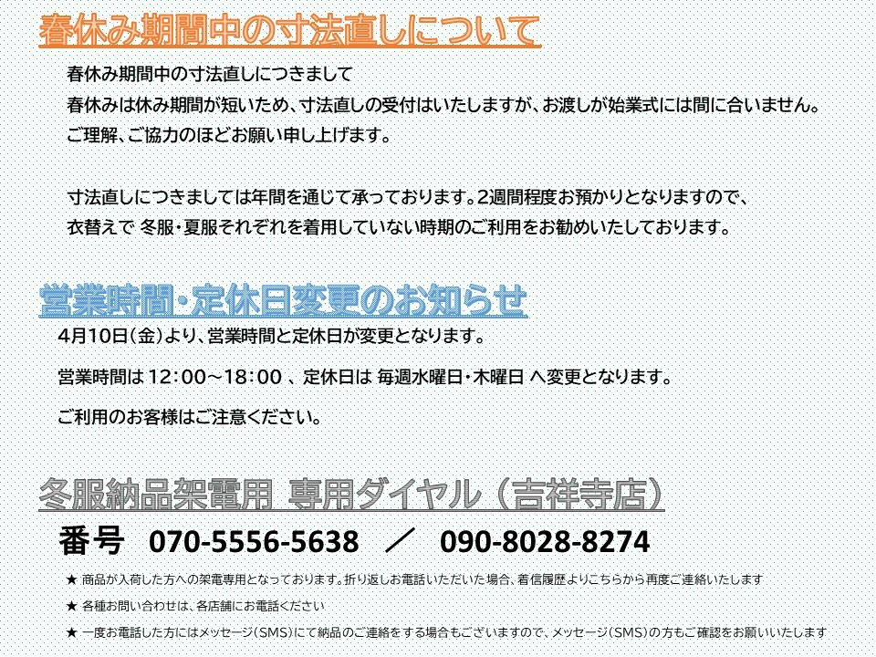 春休み期間中の寸法直しのご案内